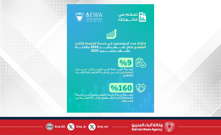 المنامة في 08 فبراير/ بنا / أكّد السيد أحمد الجامع مدير إدارة خدمات المشتركين بهيئة الكهرباء والماء، تزايد الإقبال على التسجيل في خدمة الخصم الثابت الشهري، مشيرًا إلى أن إجمالي عدد الحسابات المسجّلة في الخدمة ارتفع بنسبة 9% خلال شهر يناير 2026 مقارنة بشهر ديسمبر 2025.