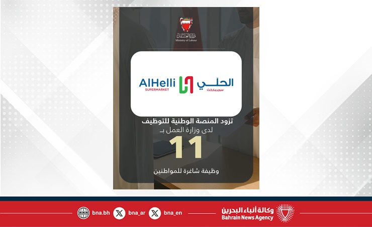 المنامة في 22 أكتوبر / بنا / في إطار تنفيذ توجيهات صاحب السمو الملكي الأمير سلمان بن حمد آل خليفة ولي العهد رئيس مجلس الوزراء حفظه الله، بعرض 3 فرص وظيفية لكل باحث عن عمل مسجل لدى وزارة العمل، الحلي سوبرماركت يزود المنصة الوطنية للتوظيف بـ 11 وظيفة شاغرة للمواطنين.