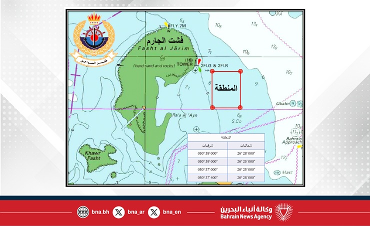 المنامة في 22 نوفمبر / بنا / أعلنت قيادة خفر السواحل أنه سوف يتم تنفيذ تمرين للرماية بالذخيرة الحية يوم الأحد الموافق 23 نوفمبر 2025، وذلك في منطقة فشت الجارم، في الفترة من الساعة 8:00 صباحًا وحتى 2:00 مساءً.