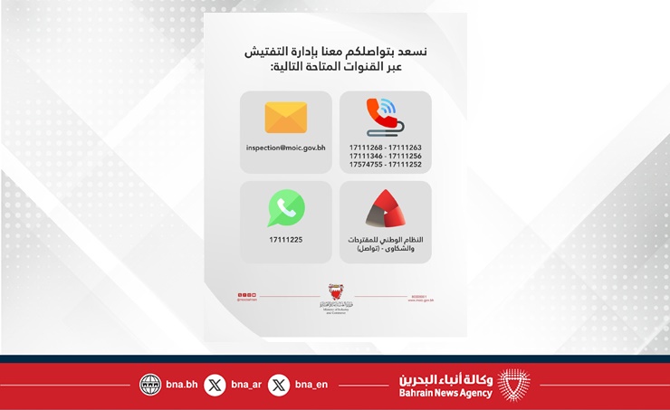كما أكدت إدارة التفتيش أهمية دور المستهلكين في دعم الرقابة، من خلال الإبلاغ عن أي مخالفات عبر النظام الوطني للمقترحات والشكاوى (تواصل)، أو عبر رقم الواتساب 17111225، أو البريد الإلكتروني: inspection@moic.gov.bh.