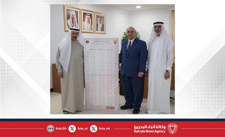 المنامة في 26 فبراير/ بنا / استقبل معالي الشيخ عبدالرحمن بن محمد بن راشد آل خليفة رئيس المجلس الأعلى للشئون الإسلامية رئيس اللجنة العليا للتقويم البحريني، في مكتبه اليوم، الأستاذ الدكتور وهيب عيسى الناصر أستاذ الفيزياء التطبيقية عضو اللجنة العليا للتقويم البحريني، حيث أهدى معاليه لوحة تتضمن الحسابات الفلكية لمواعيد حلول شهر رمضان المبارك وعيديْ الفطر والأضحى على مدى 25 عامًا، وتحديدًا للأعوام 1447 – 1472هـ، يوافقها 2026 – 2050م، وذلك وفقًا لمعايير التقويم الإسلامي الموحد.