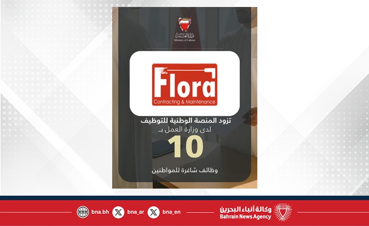 المنامة في 26 نوفمبر/ بنا / في إطار تنفيذ توجيهات صاحب السمو الملكي الأمير سلمان بن حمد آل خليفة ولي العهد رئيس مجلس الوزراء حفظه الله، بعرض 3 فرص وظيفية لكل باحث عن عمل مسجل لدى وزارة العمل، فلورا لمقاولات خدمات الصيانة تزود المنصة الوطنية للتوظيف بـ 10 وظائف شاغرة للمواطنين.