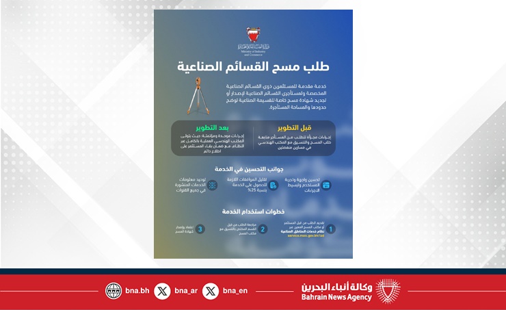 المنامة في 29 يناير/ بنا / في إطار الجهود الحكومية لتطوير جودة الخدمات وإعادة هندستها، طوّرت وزارة الصناعة والتجارة خدمة مسح القسائم الصناعية، التي تتيح إنجاز إجراءات المسح إلكترونيًا، من خلال أتمتة الخدمة وتقليل الموافقات المطلوبة، بما يسهم في تبسيط الإجراءات وتحسين تجربة المستثمرين.