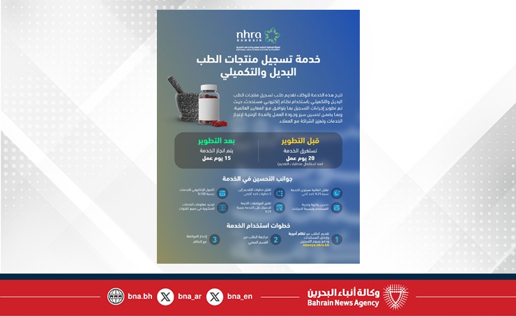 المنامة في 26 يناير/ بنا / في إطار الجهود الحكومية لتطوير جودة الخدمات وإعادة هندستها، طوّرت الهيئة الوطنية لتنظيم المهن والخدمات الصحية خدمة تسجيل منتجات الطب البديل والتكميلي، بهدف تسهيل الإجراءات وتحديث الآليات، بما ينعكس إيجابًا على تحسين تجربة المستفيدين من الوكلاء المورّدين للمنتجات.