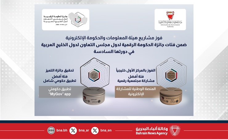 الكويت في 08 أكتوبر/ بنا / فازت مشاريع رقمية مقدمة من مملكة البحرين ضمن فئات جائزة الحكومة الرقمية لدول مجلس التعاون لدول الخليج العربية، إذ حصدت المنصة الوطنية المطوّرة للمشاركة الإلكترونية المقدمة من هيئة المعلومات والحكومة الإلكترونية (bahrain.bh/sharekna) على المركز الأول في فئة أفضل منصة للمشاركة الرقمية خليجيًا، وحقق تطبيق حكومتي (MyGov app) المقدم من الهيئة جائزة التميز في فئة (أفضل تطبيق حكومي شامل)، كما فازت اللعبة الرقمية (حارس الفضاء السيبراني) المقدمة من المركز الوطني للأمن السيبراني بالمركز الأول خليجيًا في فئة (أفضل لعبة رقمية هادفة)، وذلك خلال حفل تكريم الفائزين بالجائزة الذي تستضيفه دولة الكويت الشقيقة بالتعاون مع الأمانة العامة لمجلس التعاون لدول الخليج العربية.