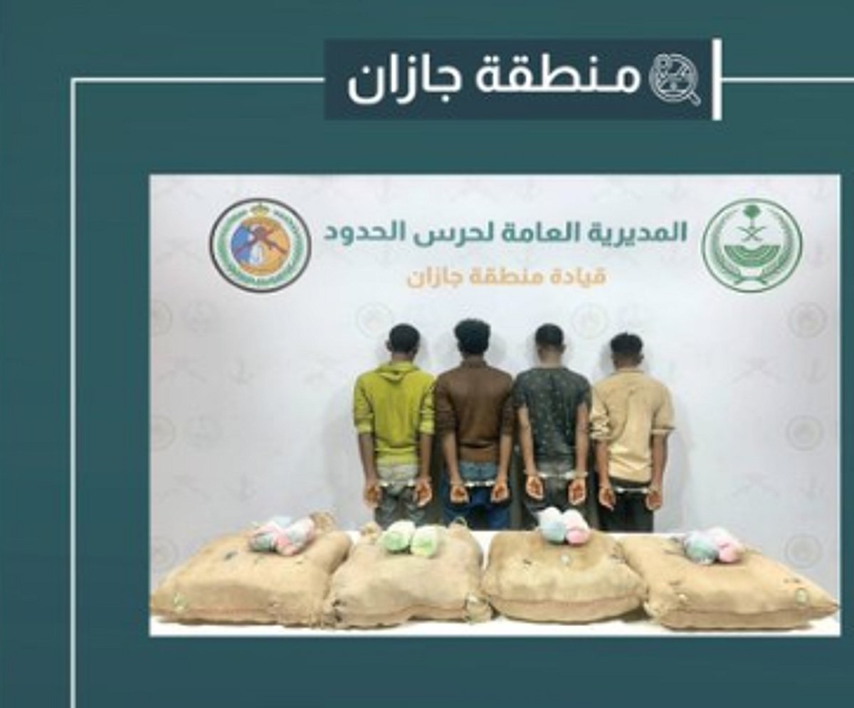 ألقت الدوريات البرية لحرس الحدود في قطاع الدائر بمنطقة جازان القبض على (4) مخالفين لنظام أمن الحدود من الجنسية الإثيوبية، لتهريبهم (80) كيلوجراما من نبات القات المخدر.