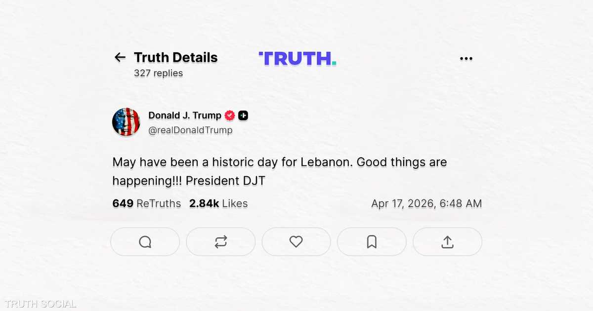 فعلى منصته تروث سوشيال، كتب ترامب تعليقا في إشارة إلى تفاؤله بمسار التهدئة يقول “قد يكون يوما تاريخيا للبنان. هناك أمور إيجابية تحدث. الرئيس دونالد جيه. ترامب”.